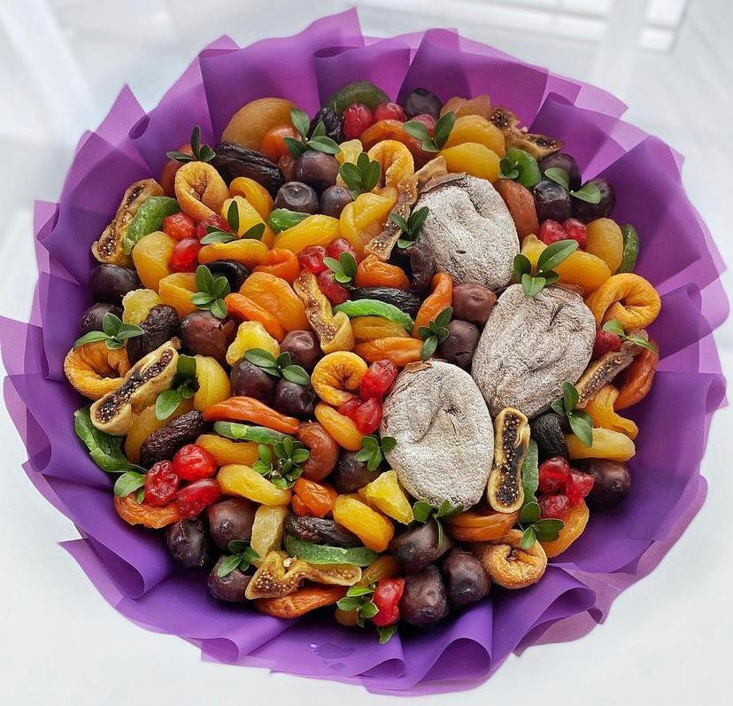 Съедобный букет «Нурсултан» — это оригинальный экзотический подарок, идеально подходящий для любого торжественного события как знак особенного внимания. Тщательно упакованный в подарочную упаковку, он сразу привлекает внимание своим ярким и впечатляющим видом. В составе сочные зеленые киви, сладкие финики, ароматный сушеный инжир, курага и спелая хурма — каждый фрукт тщательно подобран и собран в букет, чтобы стать отличным подарком для любителей экзотических вкусов. Композиция не только украсит стол, но и наполнит день яркими впечатлениями и приятными эмоциями.