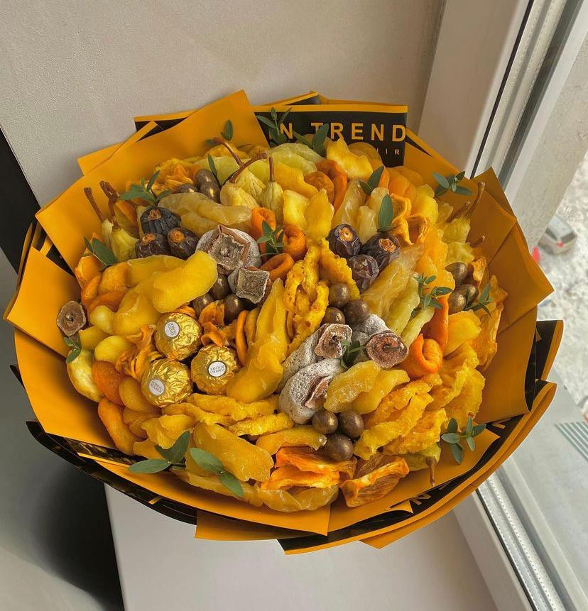 Заказала на день рождения тёти, и это было попадание в десятку! Сочные груши и ароматная дыня создают такую летнюю свежесть, а сушёная хурма и нежная курага добавляют восточной неги. Экзотическая папайя и медовые финики просто переносят в тропический сад! А золотистые Ферреро Роше - как драгоценные украшения в этом фруктовом великолепии.